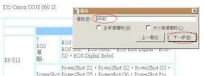 2) 在彈出視窗「尋找(F):」右列空白處打上您的相機型號。
